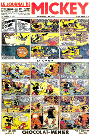 Le Journal de Mickey par Paul Winkler, qui a popularisé les personnages et le style de Disney en France Pendant la guerre sont publiés les BDs fascistes, comme Le Téméraire, et après, les BDs contre-guerre comme La bête est morte! Dans les années 50 et 60, les BDs les plus populaires étaient celles comme Tintin, Spirou et Fantasio, et Blake et Mortimer, qu'on a discutées en classe. D'après ce que je comprends, toutes ces BDs, de Bécassine jusqu'à Blake et Mortimer, utilisaient, d'une manière ou d'une autre, le style ligne claire. Par rapport aux autres arts de la même époque, ce style est assez bizarre {ou bien, les mouvements artistiques du 20e siècle étaient bizarres et le style de BD ne l'était pas}.